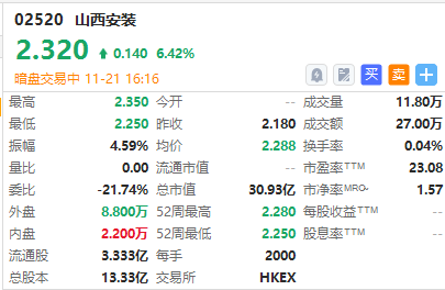 华盛资讯11月21日讯,山西安装正在暗盘交易,截至发稿,现涨6.42%,中签一手账面浮盈240港元,最新总市值30.93亿港元,该股将于明日正式挂牌港交所上市。