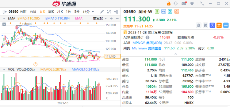 正股表现:美团-W将于下周二公布今年第三季业绩,市场料非国际财务报告准则经调整溢利介乎48.23亿至56.95亿元人民币,按年增加36.7%至61.5% ,并将关注包括到店业务竞争等的最新业务指引进展。美团昨日反弹,收市升约1.6%,今早继续上升兼重上110港元水平。现报111.3港元,升约2.11%。