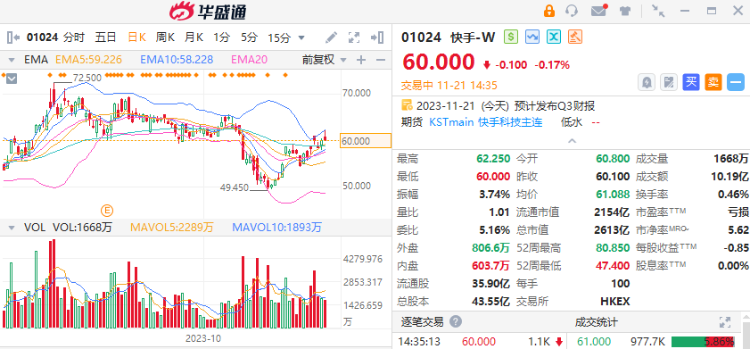 正股表现:快手-W将于今日稍后公布今年第三季业绩,市场料非国际财务报告准则经调整利润净额介乎24.41亿至28.14亿元人民币。快手昨日重上60元水平收市,升约2.6%,今早继续上升。现报60.0元,微跌0.17%。