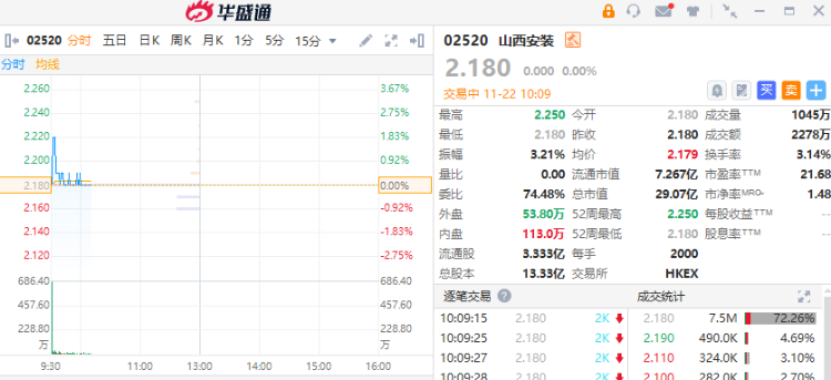 华盛资讯11月22日讯,山西安装首挂平开,盘中一度涨超3%升至2.25港元,当前成交额2278万港元,最新总市值29.07亿港元,该股昨日暗盘微跌1.83%。