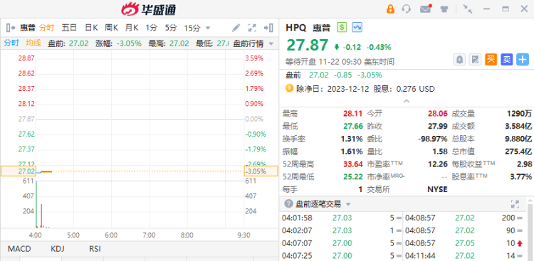 惠普绩后跌超3%,Q4营收为138亿美元,同比下降6.5%,略低于市场预期的138.8亿美元;期内个人系统业务收入为94亿美元,同比下降8%,打印部门收入为44亿美元,同比下降3%。