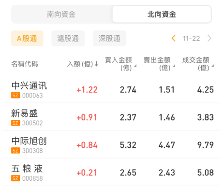 北向资金今日净买入35.39亿元。中兴通讯、新易盛分别获净买入1.22亿元、0.91亿元。比亚迪净卖出额居首,金额为3.47亿元。