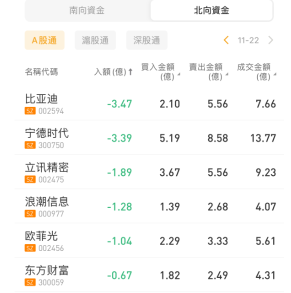 北向资金买入中兴通讯,沽出比亚迪