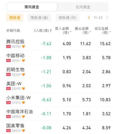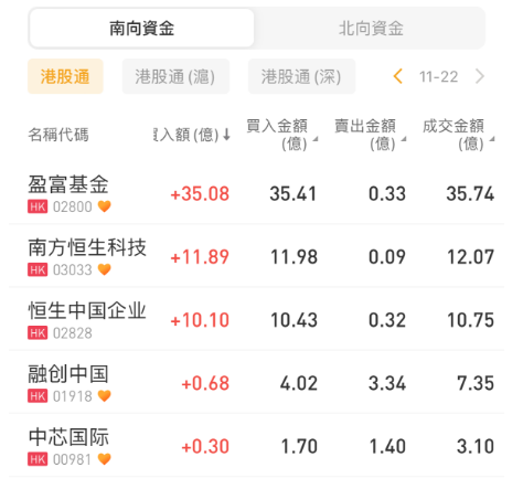 南下资金大手笔净买入盈富基金35.08亿港元,港股ETF南方恒生科技、恒生中国企业获净买入11.89亿港元、10.10亿港元;腾讯控股、中国移动遭抛售7.62亿港元、1.88亿港元。