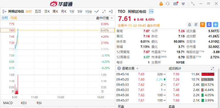 阿根廷基准股票指数MERVAL上涨超过6%,在美上市的阿根廷概念股集体拉升,阿根廷电信涨超6%,阿根廷北方电力公司涨超3%,阿根廷南部燃气涨超1%。