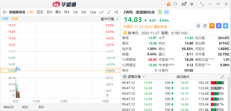 诺德斯特龙跌超5%,第三季度净销售额为33.2亿美元,同比下降6.8%,低于市场预期的34.2亿美元。