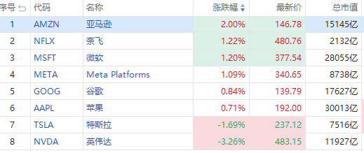 明星科技股多数上扬,亚马逊涨2%,奈飞、微软、Meta均涨超1%,苹果、谷歌跟涨;特斯拉跌近2%,英伟达绩后跌超3%。