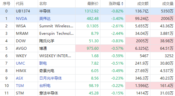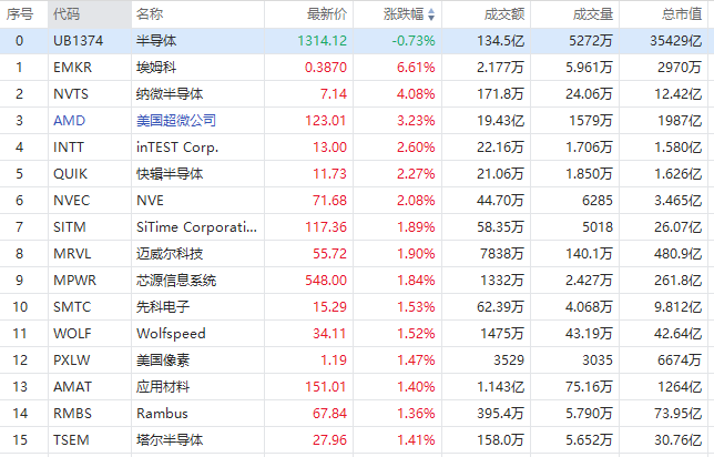 美股半导体概念股走势分化,截至发稿,纳微半导体涨超4%,AMD涨超3%,迈威尔科技涨近2%;英伟达跌超3%,博通、联电、台积电等微跌。