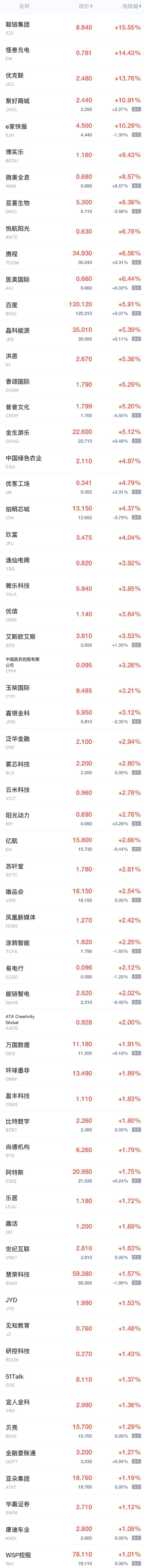 聪链集团涨超15%,怪兽充电涨超14%,优克联涨超13%,亘喜生物涨超8%,携程等涨超6%,百度,洪恩,金生游乐等涨超5%,拍明芯城等涨超4%,逸仙电商,雅乐科技,嘉银金科等涨超3%,泛华金融,雾芯科技,亿航,唯品会,涂鸦智能,能链智电等涨超2%,万国数据,环球墨非,比特数字,阿特斯,世纪互联,宜人金科,贝壳,WSP控股等涨超1%。