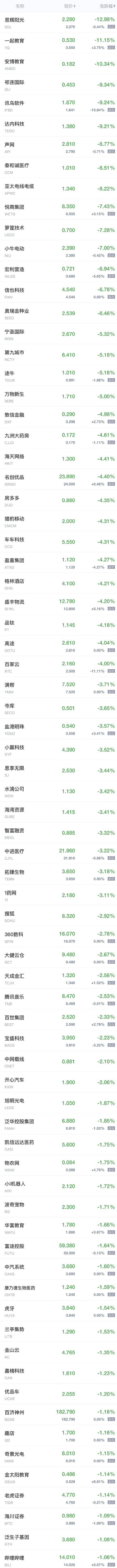 昱辉阳光跌超12%,小牛电动等跌超7%,信也科技等跌超6%,途牛,万物新生等跌超5%,名创优品,车车科技,格林酒店,盛丰物流,高途,百家云等跌超4%,满帮,小赢科技,思享无限,水滴公司,拓臻生物等跌超3%,搜狐,360数科,腾讯音乐等跌超2%,泛华控股集团,虎牙,兰亭集势,金山云,嘉楠科技,百济神州,趣店,奇景光电,老虎证券,海川证券,哔哩哔哩等跌超1%。