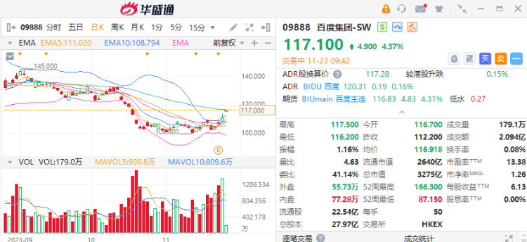 11月23日,百度集团本周披露业绩后连升3日,今日盘初涨4.72%报117.5港元。隔夜美股市场百度收涨5.91%报120.12美元,折算成港股市场价格为117.26港元/股。