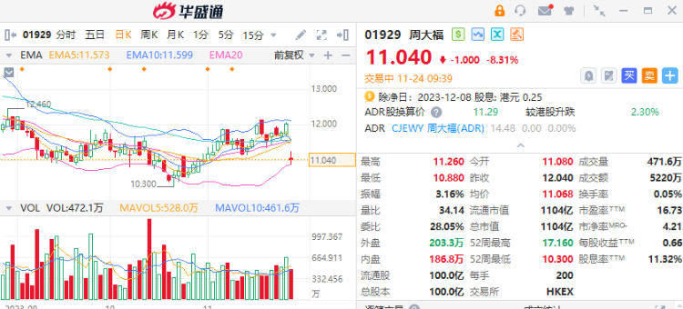 11月24日讯,港股周大福(01929)绩后低开近8%,截至发稿,跌8.31%,报11.04港元,成交额5220港元。