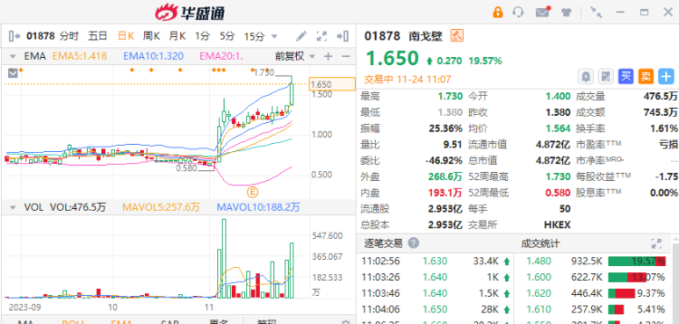 11月24日讯,港股南戈壁(01878)大涨20%,现报1.65港元,月内涨幅高达140%,股价创近一个月来新高。