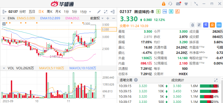 11月24日讯,港股腾盛博药-B早盘放量大涨逾12%,截至发稿报3.33港元,当前成交额8640万港元。
