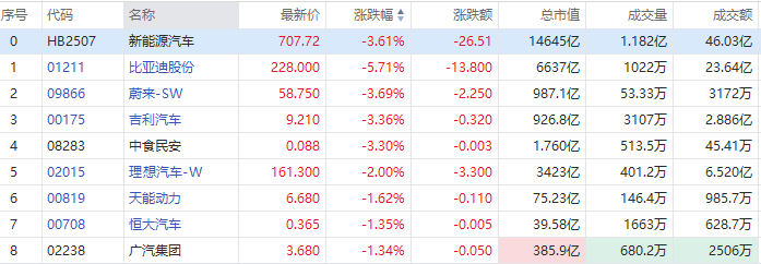 今日港股汽车板块短线领跌回调,截至发稿比亚迪股份跌超5%,吉利汽车、蔚来-SW(09866.HK)双双跌超3%,北京汽车(01958.HK)、理想汽车-W(02015.HK)跟跌。