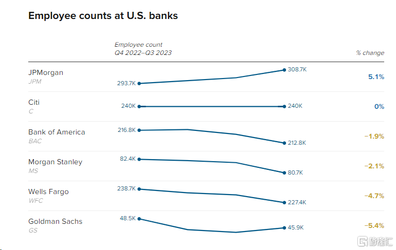 数据来看,削减幅度最大的是富国银行和高盛。今年到目前为止,他们各自已裁员约 5%。