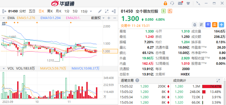 交个朋友控股(01450)尾盘上涨4.80%,现报1.31港元,成交额236.20万港元。