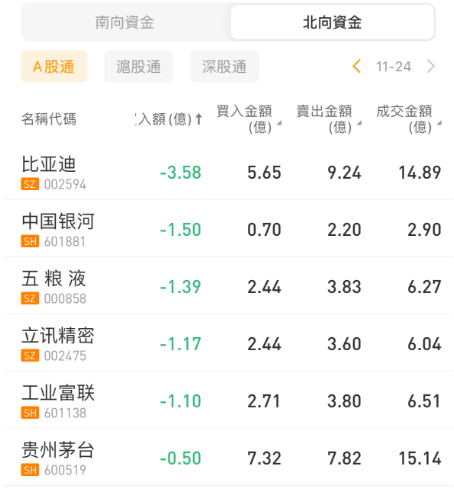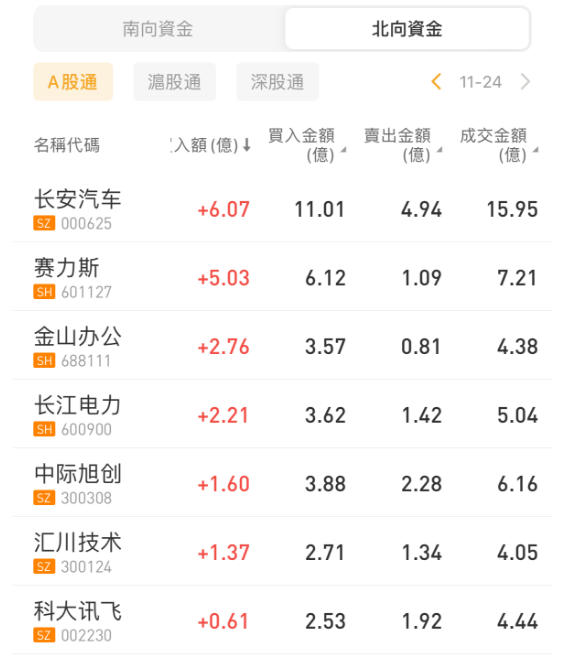 北向资金今日净卖出61.96亿元。长安汽车、赛力斯分别获净买入6.07亿元、5.03亿元。比亚迪净卖出额居首,金额为3.58亿元。
