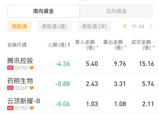 南下资金净买入盈富基金50.66亿港元,零跑汽车、小鹏汽车-W获净买入2.62亿港元、2.35亿港元;腾讯控股再遭抛售4.36亿港元。