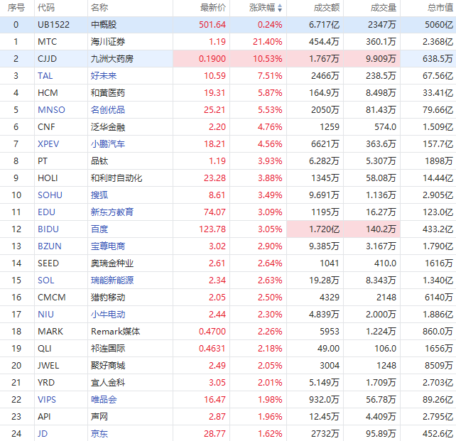 华盛资讯11月24日消息,美股早盘中概股走势分化,截至发稿,好未来涨超7%,和黄医药、名创优品涨超5%,小鹏汽车涨超4%,新东方教育、百度涨超2%,宝尊电商、小牛电动涨超2%,唯品会、京东涨近2%;网易、蔚来跌超2%,晶科能源跌近2%。