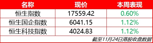 本周恒生指数涨幅0.6%,报17559.42点;恒生科技指数涨幅1.12%,报4024.83点;国企指数涨幅1.12%,报6041.15点。
