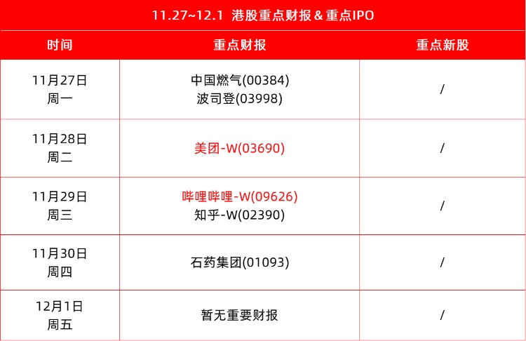 财报方面重点关注:美团-W、哔哩哔哩-W