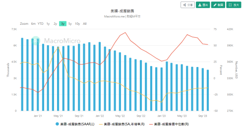 美国房地产经纪人协会NAR公布10月份成屋销售下跌4.1%至年率计379万间,跌幅大过预期1.5%至年率计390万间。连跌5个月,并创自2010年8月以来,近13年的新低。期内出售房屋的中位价为39.18万美元,按年升3.4%,为自1999年有纪录以来,最高房价的月份。