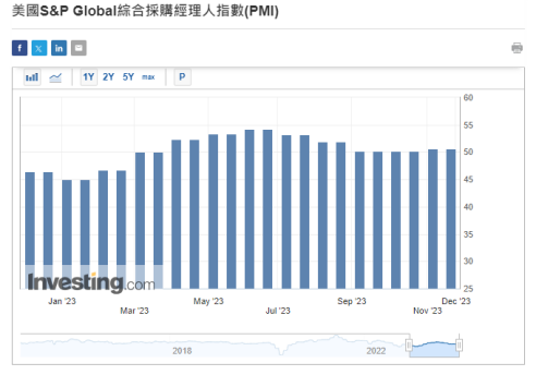 美国公布11月份标普全球采购经理指数PMI,制造业PMI报49.4,低过预期49.8,及上月50。数据反映制造业经营情况持续下降,更跌落50以下收缩区。同月份服务业PMI意外上升至50.8,高过预期50.4,及10月50.6。期内综合PMI报50.7,跟10月份一样。