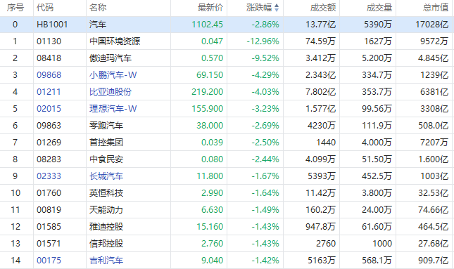今日港股汽车股集体走低,截至发稿,小鹏汽车-W、比亚迪股份跌超4%,理想汽车-W跌超3%,零跑汽车跌超2%,长城汽车、吉利汽车跌超1%。