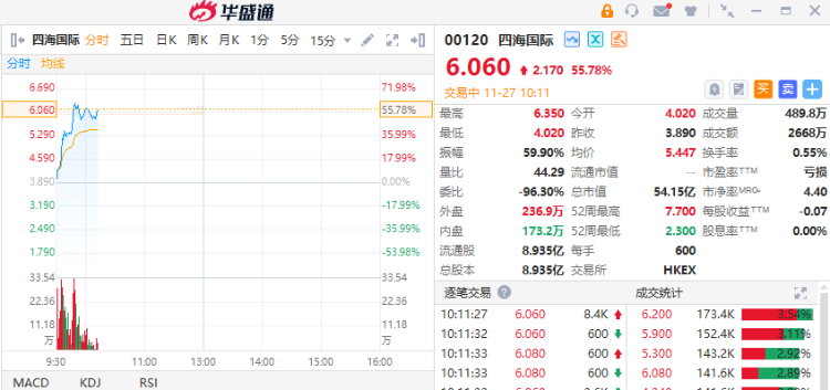 11月27日,四海国际(00120)再度走妖,截至发稿,涨55.78%,报6.06港元,成交额2668万港元。