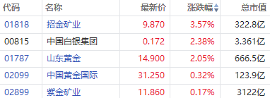 11月27日,黄金股早盘普涨,截至发稿,招金矿业涨近4%,中国白银集团、山东黄金涨超2%,中国黄金国际、紫金矿业跟涨。