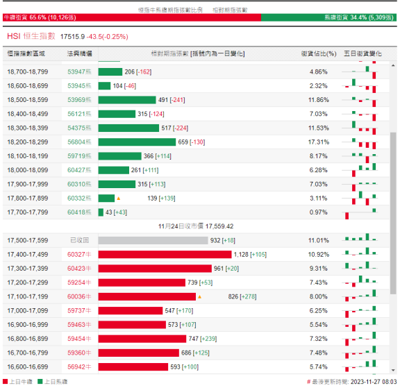 街货分布方面,至上周五,恒指牛证街货重货区间主要在收回价17900点至18600点之间,累计相当约2924张期指合约;恒指熊证街货重货区主要在收回价17000点至17600点,累计相当约5133张期指合约。