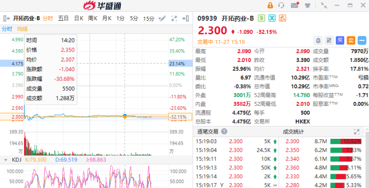 受今日早间利空消息影响,开拓药业-B $09939.HK 开盘即大幅走低。截至发稿,跌32.15%,报2.3港元。