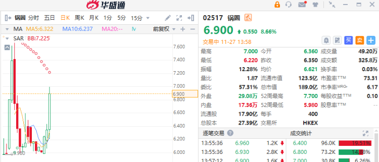 港股“预制菜第一股”锅圈(02517)涨超8%,截至发稿,涨8.66%,报6.9港元,成交额325.8万港元。