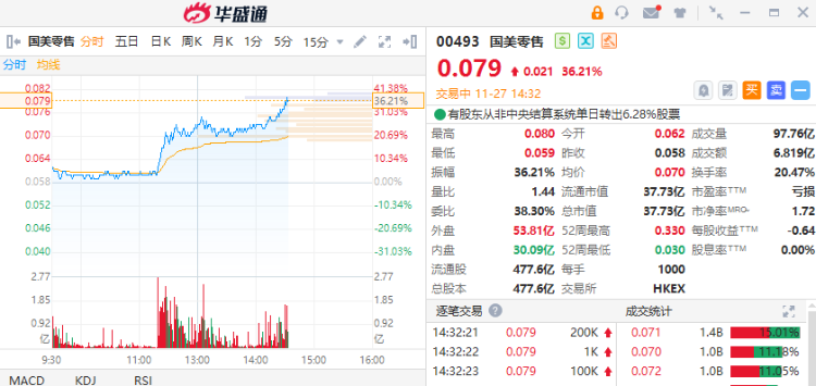 华盛资讯11月27日消息,国美零售午后持续上行,截至发稿,涨36.21%,报0.079港元,成交额6.819亿港元。值得关注的是,该股近7个交易日,累计涨幅超150%。