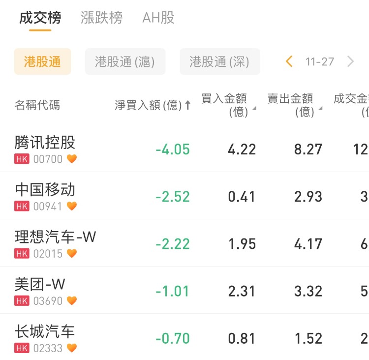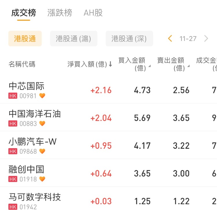 南下资金净买入中芯国际2.16亿港元,中国海洋石油、小鹏汽车-W获净买入2.04亿港元、0.95亿港元;腾讯控股、中国移动分别遭抛售4.05亿港元、2.52亿港元。