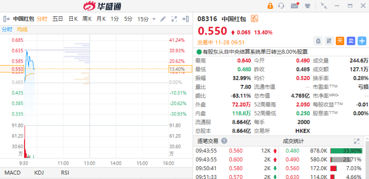 11月28日,中国红包(08316)早盘快速拉升,一度涨超21%,截至发稿,涨13.4%,报0.55港元,成交额127.1万港元。
