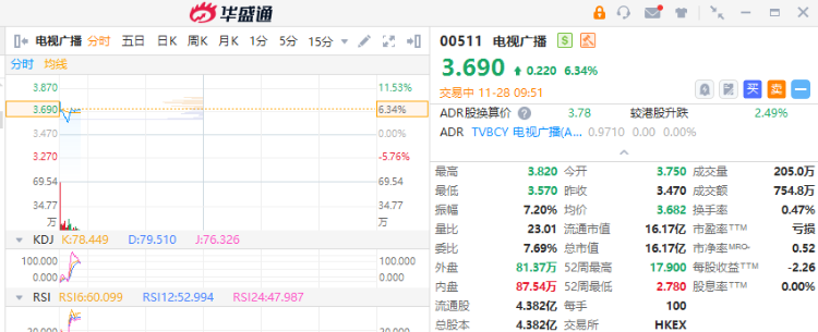 华盛资讯11月28日消息,电视广播(00511)高开8%,现涨超6%,报3.69港元,最新成交额754.8万港元。