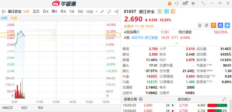 11月28日,浙江世宝(01057)早盘一度大涨超13%,截至发稿,涨10.25%,报2.69港元,成交额8435万港元。