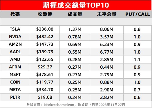 1、特斯拉 $TSLA 收高0.27%。当日期权成交总量达137万张。期权持仓量减少7.7%,达到了810万张。最显著的增加发生在2023年12月1日到期的期权上,增加了7.72万张。