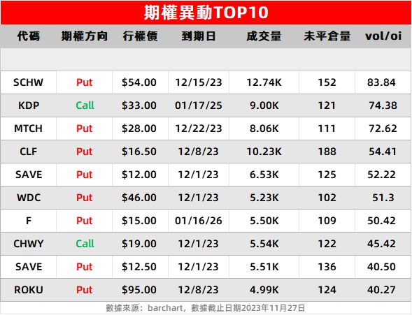 2、美版花呗Affirm $AFRM 大涨11.97%。当日期权成交总量达27万张,较上一日增长2.88倍。最显著的增加发生在2023年12月1日到期的期权上,增加了10,819张。消息上,据Adobe调查显示,“黑五”期间,约有7900万美元的销售额来自选择“先买后付”的方式支付的消费者,比去年增长了47%。