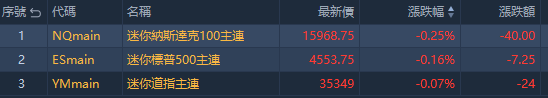 周二美股盘前,三大股指期货小幅走低,截至发稿,纳指期货 $NQmain 现跌0.25%,标普500指数期货 $ESmain 现跌0.16%,道指期货 $YMmain 现跌0.07%。