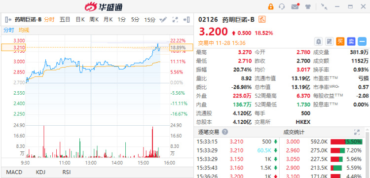 11月28日,港股生物医药板块延续涨势,个股呈现普涨格局。截至发稿,药明巨诺-B涨超18%,德琪医药-B涨近11%,康诺亚-B、东曜医药-B跟涨超3%。