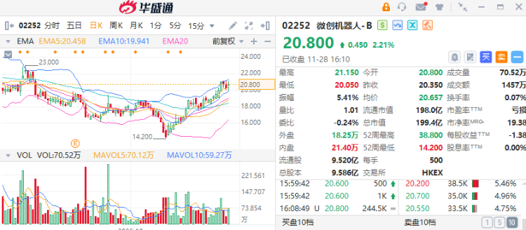 11月24日,微创机器人-B盘中股价达到21.2港元,大有超过年中高点之势。并且从10月24日低点14.2港元来计算,微创机器人一个月内的股价涨幅达到49.3%。