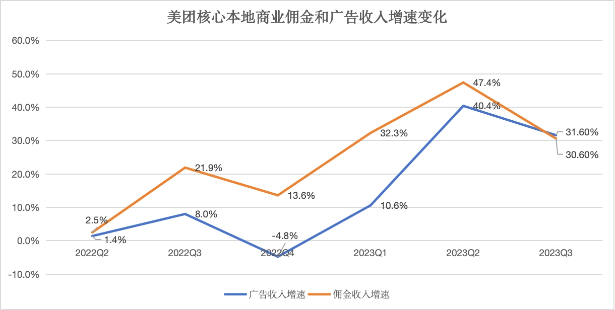 美团核心本地商业佣金和广告收入增速变化 数据来源:财报