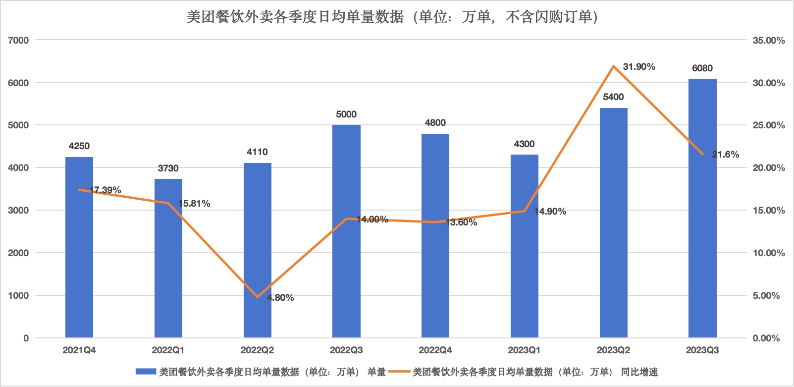 本季度美团即时配送订单达到61.79亿单,折算下来日均单量是6800万,这里面包含餐饮外卖和闪购订单。36氪了解到,闪购本季度的日均单量在700万出头,这意味着餐饮外卖Q3的日均单量突破了6000万,提前完成年度目标,订单增速也超过市场预期,达到了21%,与营收增速几乎持平。