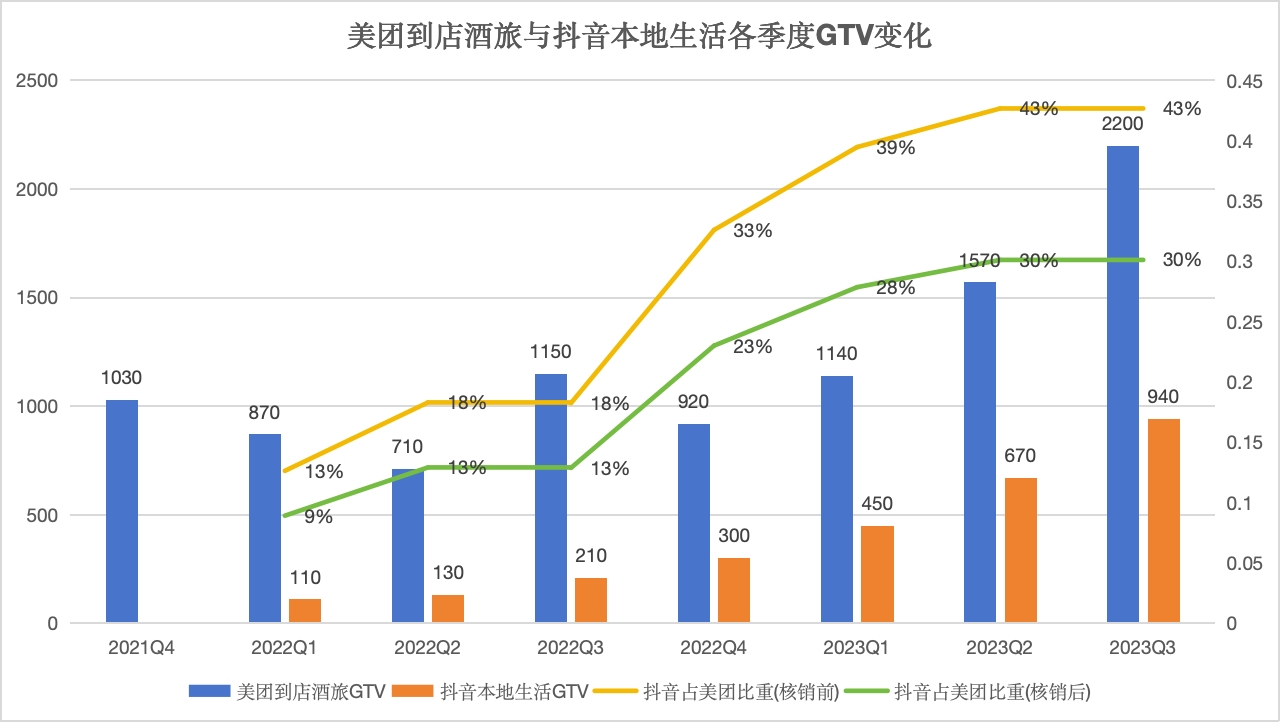 美团到店酒旅与抖音本地生活各季度GTV变化 数据来源:财报、券商调研纪要
