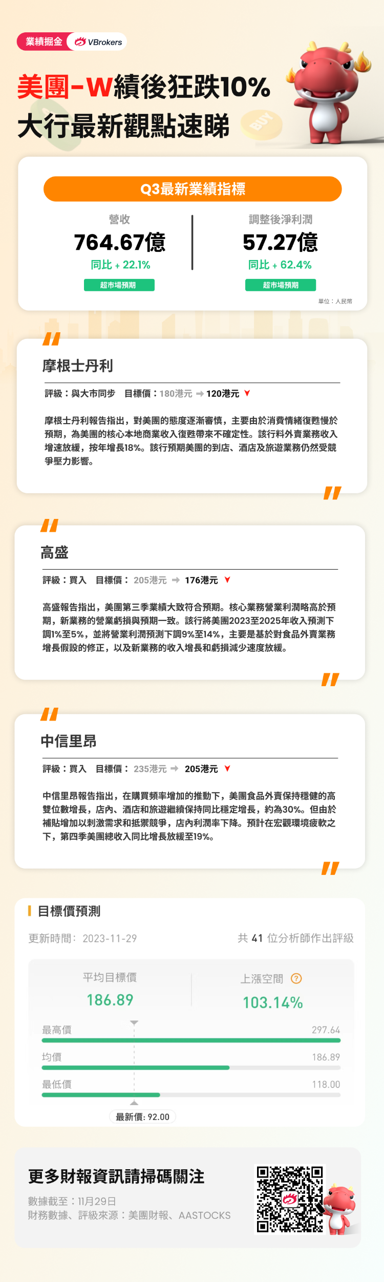 虽然多项业绩指标超出预期,但美团绩后依然遭大行下调目标价。其中,高盛指,预计美团第四季经营利率疲软,尤其在核心本地商业方面,以推动业务增长,将其目标价由205港元降至176港元,维持“买入”评级。摩根士丹利发表报告指出,对美团的态度逐渐审慎,主要由于消费情绪复苏慢于预期,为美团的核心本地商业收入复苏带来不确定性,评级由「增持」降至「与大市同步」。