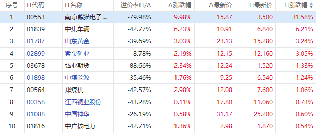 截至发稿,南京熊猫电子股份A股涨停,H股涨31.58%;中集车辆A股涨6.23%,H股现涨6.21%;山东黄金A股涨3.03%,H股涨3.24%。