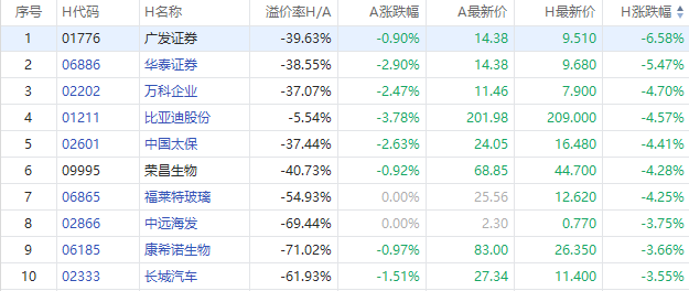 广发证券A股跌近1%,H股现跌6.58%;华泰证券A股跌2.9%,H股跌5.47%;万科企业A股跌2.47%,H股跌4.7%。